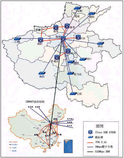 作為CERNET在全國除我國臺灣之外的38個省級節(jié)點(diǎn)之一,鄭州大學(xué)的網(wǎng)絡(luò)建設(shè)已經(jīng)相當(dāng)成熟,但是在全省范圍內(nèi)的網(wǎng)絡(luò)連接速度仍然比較低。作為河南省教研網(wǎng)絡(luò)的軟硬件平臺,CERNET骨干網(wǎng)絡(luò)是全省的教育信息化工作基礎(chǔ),如果不能消除掉2M的低速網(wǎng)絡(luò)瓶頸,必然會使河南省的教育與科研工作受到相當(dāng)限制,因此,網(wǎng)絡(luò)改造勢在必行。