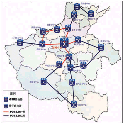 HERNET一期工程主干網(wǎng)采用IP POS技術(shù),應(yīng)用AVVID網(wǎng)絡(luò)體系結(jié)構(gòu),采用骨干傳輸網(wǎng)、城域網(wǎng)、接入網(wǎng)三層設(shè)計方案,以省網(wǎng)絡(luò)中心(設(shè)在鄭州大學(xué)網(wǎng)絡(luò)中心)、地市網(wǎng)絡(luò)中心、校園網(wǎng)三級管理模式。由省網(wǎng)絡(luò)中心向下以2.5G速度連接到各地市網(wǎng)絡(luò)中心,而向上則以155M速度連接到CERNET及Internet。整個一期工程實(shí)現(xiàn)了包括鄭州、許昌、平頂山、開封、洛陽、濟(jì)源、焦作以及新鄉(xiāng)等7個地市的2.5G連接,并形成了一個環(huán)網(wǎng)狀冗余拓?fù)浣Y(jié)構(gòu),確保當(dāng)網(wǎng)絡(luò)的一個節(jié)點(diǎn)出現(xiàn)問題時,數(shù)據(jù)可以通過其他途徑傳輸?shù)侥康牡兀谝黄诠こ掏瓿珊,?0多所大學(xué)、中小學(xué)等教育與科研單位以千兆速度連接到HERNET上,共有近50萬的用戶能夠充分利用高速帶寬獲得教育網(wǎng)資源。