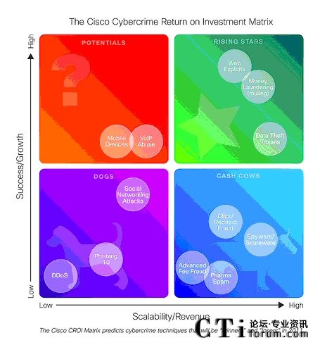 通過思科CROI矩陣對網(wǎng)絡(luò)犯罪類型的分析,思科安全專家預(yù)測:在2011年,以獲得非法利益為目的的網(wǎng)絡(luò)犯罪將會分流他們的資源。