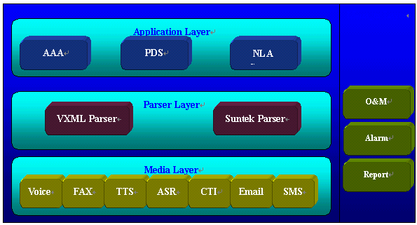SSurnon-IVR系統(tǒng)分為支撐系統(tǒng)和應(yīng)用服務(wù)器兩大部分,支撐系統(tǒng)的核心為Browser Layer。由它來解釋和執(zhí)行流程的業(yè)務(wù)邏輯,由Media Layer提供具體的操作,主要是管理語音、傳真、IP等資源,對Browser Layer屏蔽掉硬件的區(qū)別,提供統(tǒng)一的接口,以插件的形式提供各種功能。在它們之外還有配置管理、維護(hù)監(jiān)控、告警管理、統(tǒng)計(jì)報(bào)表等。應(yīng)用服務(wù)器部分包括外呼管理、數(shù)據(jù)庫中間件,傳真網(wǎng)關(guān)、自然語音理解引擎等。具體的結(jié)構(gòu)見下圖: