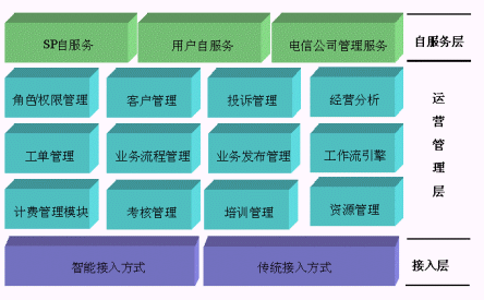 SP統(tǒng)一管理系統(tǒng)從功能邏輯上劃分,我們歸納為三大功能層來(lái)對(duì)系統(tǒng)進(jìn)行總體的介紹:接入層、運(yùn)營(yíng)管理層、自服務(wù)層。如下圖所示: