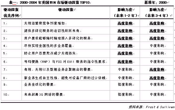 根據(jù)Frost & Sullivan 分析預測,2000-2004年美國WIN設備市場呈現(xiàn)相對均衡的發(fā)展趨勢,其TOP10的影響因素與影響力度見下表: