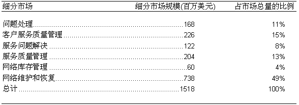 如圖二所示, 2000年, 在美國的固定網(wǎng)OSS服務(wù)保障市場的六個細分市場中, 規(guī)模最大的是網(wǎng)絡(luò)維護和恢復(fù)市場, 市場總額約為7.38億美元, 占整個市場的49%; 而規(guī)模最小的是網(wǎng)絡(luò)庫存管理市場, 市場總額約為6千萬美元, 僅占整個市場的4%左右。