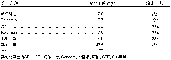 從目前市場情況來看,美國的固定網(wǎng)OSS服務(wù)保障的市場集中度相當高。在市場中領(lǐng)先的公司一共有5家,它們分別是朗訊科技、Telcordia科技、惠普公司、Hekimian和北電網(wǎng)絡(luò)。這五家公司均是較早進入這一市場的老牌公司。2000年,它們在固定網(wǎng)OSS服務(wù)保障領(lǐng)域的銷售額總和為8.60億美元,約占整個市場的56.5%左右,另外43.5%的市場被約其他二十多家廠商分割。