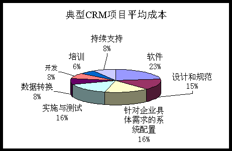 在企業(yè)確定了符合需求的CRM解決方案,包括軟件、供應商以及技術(shù)性能之后,仍然有很多其他因素值得考慮。最主要的因素之一即成本。典型的項目的預算成本中軟件成本占1/3,咨詢、實施和培訓成本占2/3。如下圖所示: