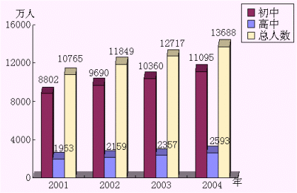 2001年,中國大陸中學(xué)學(xué)生人數(shù)已達(dá)10765萬人,而且學(xué)生人數(shù)還在快速增長。初中學(xué)生人數(shù)以每年6.5%的速度增長,普通高中學(xué)生人數(shù)也以每年10%-11%的速度增長?梢钥闯,教育市場巨大的潛力和商機(jī)。