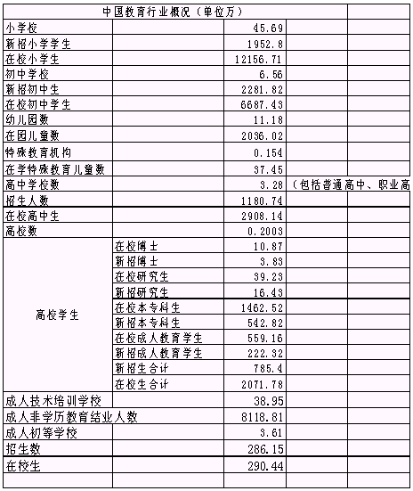 按照教育部2002年發(fā)布的《2002年全國教育事業(yè)發(fā)展統(tǒng)計(jì)公報(bào)》,教育部將整個社會的教育各個環(huán)節(jié)分為以下幾個部分: