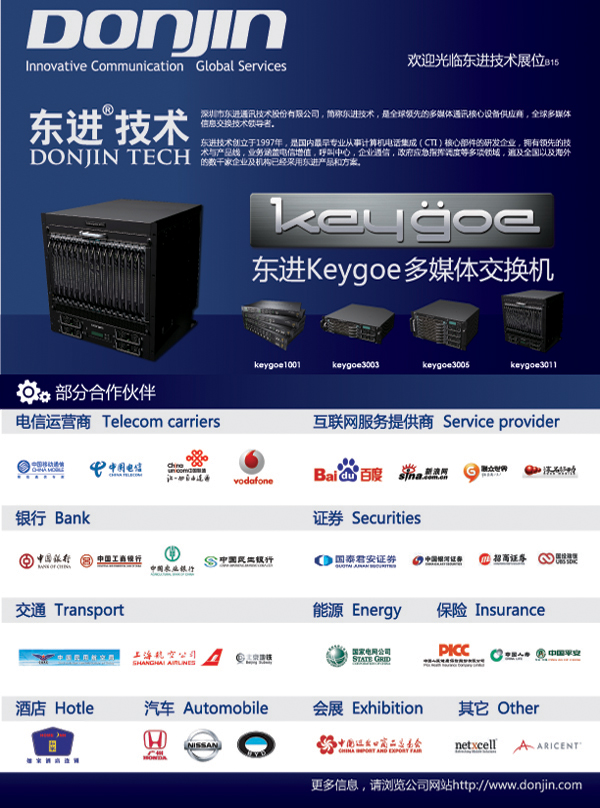 全球領(lǐng)先的多媒體通訊核心設(shè)備供應商深圳市東進通訊技術(shù)股份有限公司,創(chuàng)立于1997年,是政府認定的高新技術(shù)企業(yè),“創(chuàng)新通訊”的倡導者。作為國內(nèi)最早專業(yè)從事計算機電話集成(Computer Telephony Integration,簡稱CTI)核心部件的研發(fā)企業(yè),公司聚集了一流的產(chǎn)品研發(fā)工程師,始終保持全球技術(shù)領(lǐng)先地位。東進產(chǎn)品的裝機端口數(shù)穩(wěn)居同行業(yè)第一位。