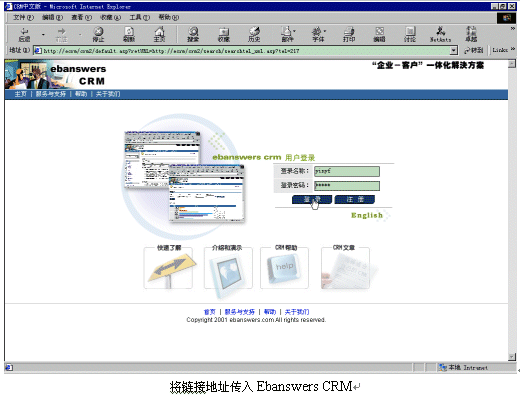 Ebanswers CRM系統(tǒng)去激活相關(guān)客戶資料的IE頁面進行處理:如果此號碼數(shù)據(jù)庫中存在,則顯示此人的信息,如果不存在,則顯示CRM中添加新線索的頁面。而Ebanswers