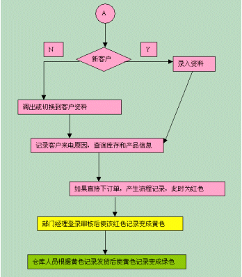 可以根據(jù)訂單上的不同顏色來判斷流程走到的階段。流程開始時候,訂單的列表中會產(chǎn)生一條紅色記錄,部門經(jīng)理登錄審核后使該紅色記錄變成黃色,倉庫人員根據(jù)黃色記錄發(fā)貨后使黃色記錄變成綠色。