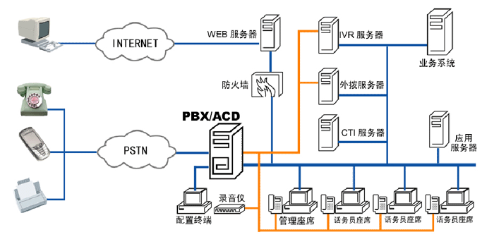 客戶服務(wù)中心可以形象的理解為客戶關(guān)懷中心、客戶聯(lián)系中心、電話服務(wù)中心、客戶支持中心、服務(wù)熱線等。從技術(shù)的角度看,客戶服務(wù)中心是一組座席員集中進(jìn)行來電處理和發(fā)出呼叫與客戶聯(lián)系的專門的系統(tǒng)。呼叫中心系統(tǒng)結(jié)構(gòu)為: