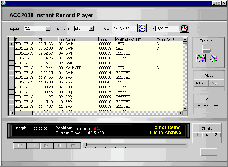 ACC2000 多媒體溝通中心采用最先進(jìn)的海量存儲設(shè)備DVD RAM構(gòu)建實(shí)時多通道語音錄制、備份系統(tǒng)��ACC2000 DVD Record Backup。這個系統(tǒng)可以根據(jù)管理員設(shè)定的錄音對象,對符合錄音條件的通話自動進(jìn)行錄音。