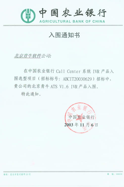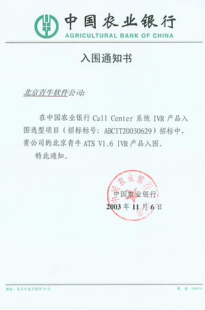中國(guó)農(nóng)業(yè)銀行是四大國(guó)有獨(dú)資商業(yè)銀行之一,被《財(cái)富》評(píng)為世界500強(qiáng)企業(yè)之一。目前農(nóng)行已在全國(guó)范圍內(nèi)開通95599特服電話短號(hào)碼,為進(jìn)一步整合現(xiàn)有電話銀行和客服中心資源,提高客戶滿意度和忠誠(chéng)度,并通過客服中心的渠道,加快農(nóng)行金融產(chǎn)品的推廣,中國(guó)農(nóng)業(yè)銀行將在全國(guó)36個(gè)省域分行的基礎(chǔ)上加快建設(shè)成總行集中管理、標(biāo)準(zhǔn)服務(wù)集中、特色服務(wù)分散,統(tǒng)一客戶服務(wù)界面的全國(guó)客戶服務(wù)中心系統(tǒng)。為此,中國(guó)農(nóng)業(yè)銀行科技部就Call Center系統(tǒng)的關(guān)鍵性產(chǎn)品,CTI、PBX、 IVR產(chǎn)品向國(guó)內(nèi)外著名廠商進(jìn)行入圍招標(biāo)活動(dòng),參與廠商匯集國(guó)內(nèi)外各大知名企業(yè),是一次國(guó)際水平的重量級(jí)選型過程。通過嚴(yán)格的技術(shù)測(cè)試和綜合考評(píng),中國(guó)農(nóng)業(yè)銀行確認(rèn)了Call Center系統(tǒng)的入圍產(chǎn)品廠商名單,青牛軟件的CTI產(chǎn)品-青牛USE,IVR產(chǎn)品-青牛ATS在多項(xiàng)測(cè)評(píng)中名列前茅。
