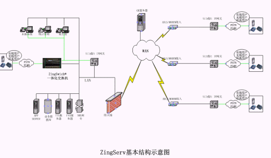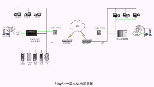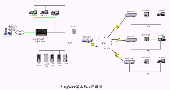 硬件:中心有ZingSwitch®,O口網(wǎng)關和內(nèi)線卡。座席端配置S口網(wǎng)關。