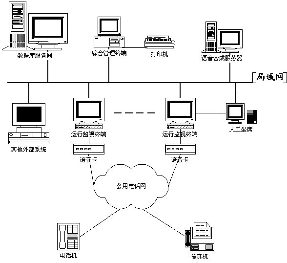 管理終端通道設(shè)置、業(yè)務(wù)內(nèi)容設(shè)置、操作人員管理,打印各種報(bào)表、報(bào)警數(shù)據(jù)。上面安裝綜合管理子系統(tǒng),操作系統(tǒng)為Windows 95/98/2000