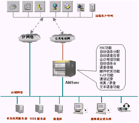 該系統(tǒng)包括 ALTISERVE®、IVR、 自動(dòng)傳真、 智能選擇坐席ACD、 來(lái)電號(hào)碼的顯示、監(jiān)督系統(tǒng)、客戶(hù)資料的查詢(xún)與錄入、查詢(xún)統(tǒng)計(jì)、現(xiàn)有資源的集成、開(kāi)放的 WEB接口等等。 ALTIGEN 高度整合通訊服務(wù)器 ALTISERVE® 系統(tǒng),為該客服系統(tǒng)提供了強(qiáng)大的交換功能,同時(shí)還集成了多種服務(wù)器功能。由于采用自己特有的交換系統(tǒng),使得系統(tǒng)的穩(wěn)定性更好,譬如,湖南株州工商的呼叫中心系統(tǒng)自運(yùn)行一年多來(lái),從未出現(xiàn)任何故障。另外,尤為出色的是系統(tǒng)具有良好的相容性,克服了諸多廠(chǎng)商生產(chǎn)的交換機(jī)相互不兼容的缺陷。因此,系統(tǒng)完全實(shí)現(xiàn)了高可靠性、穩(wěn)定性和相容性的國(guó)際化水平。