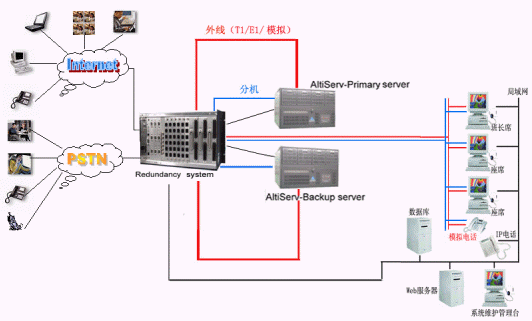 奧迪堅(jiān)通訊系統(tǒng)有限公司作為CTI通訊平臺的提供商,在技術(shù)上不斷創(chuàng)新,對產(chǎn)品精益求精,尤其體現(xiàn)在對系統(tǒng)的運(yùn)行安全性的要求上,為了防止電信接入設(shè)備或者企業(yè)網(wǎng)絡(luò)出現(xiàn)故障而造成的呼叫中心服務(wù)中斷,奧迪堅(jiān)呼叫中心系統(tǒng)提供安全保護(hù)冗余切換系統(tǒng),來保障呼叫中心在意外情況下的正常工作,該安全冗余切換系統(tǒng)通過對電源、T1/E1、模擬trunk、分機(jī)座席、以及各種網(wǎng)絡(luò)鏈路串口等備份切換來實(shí)現(xiàn)可靠的運(yùn)行。除此之外,奧迪堅(jiān)系統(tǒng)本身也提供強(qiáng)大的安全保障,由于采用先進(jìn)IP內(nèi)核一體化設(shè)計(jì),集傳統(tǒng)PBX、CTI服務(wù)器、IVR、ACD、Recording、FAX等眾多設(shè)備于一體,這樣有效的避免了因?yàn)橥鈷煸O(shè)備過多以及設(shè)備供應(yīng)商的不同而存在的兼容性的問題,從而降低了給呼叫中心系統(tǒng)帶來的的不穩(wěn)定的安全隱患。在系統(tǒng)之外依靠安全保護(hù)冗余切換系統(tǒng),可以實(shí)現(xiàn)外線、分機(jī)、以及各種鏈路接口的雙倍安全運(yùn)行。如上圖所示:兩臺奧迪堅(jiān)的呼叫中心服務(wù)器和奧迪堅(jiān)安全冗余切換系統(tǒng)構(gòu)成呼叫中心熱備份系統(tǒng),在兩臺服務(wù)器中安裝所有的呼叫中心功能模塊。通常情況下由主呼叫中心服務(wù)器提供系統(tǒng)的正常運(yùn)行,備份服務(wù)器通過安全保護(hù)冗余切換系統(tǒng)的服務(wù)監(jiān)測模塊來監(jiān)測主服務(wù)器的各項(xiàng)設(shè)備和鏈路的使用情況,當(dāng)主服務(wù)器遭遇突發(fā)故障不能繼續(xù)工作時,系統(tǒng)馬上實(shí)施自動切換,就會通過安全保護(hù)冗余切換系統(tǒng)將系統(tǒng)切換到備份的呼叫中心系統(tǒng)上來,此鏈路可以是數(shù)據(jù)、語音、網(wǎng)絡(luò)、串口等。當(dāng)安全保護(hù)冗余切換系統(tǒng)自身出現(xiàn)斷電或者其他故障時,所有鏈路均保持正常工作狀態(tài)。