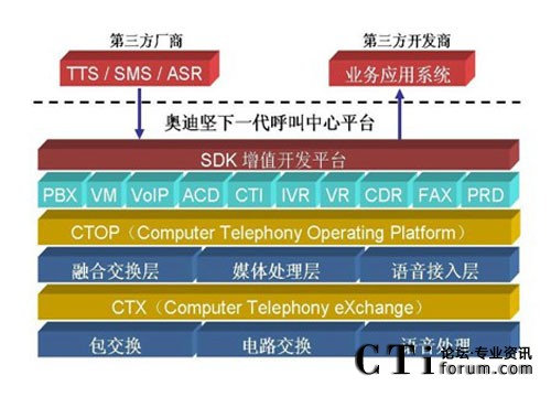 奧迪堅 IP 呼叫中心平臺的 CTOP(Computer Telephony Operating Platform) 核心技術(shù)架構(gòu)為業(yè)界最領(lǐng)先的融合交換、媒體處理和語音接入三層平臺應(yīng)用架 構(gòu)。值得一提的是,這一應(yīng)用架構(gòu)不僅僅針對交換機部分,而是針對呼叫中心的 PBX、ACD、CTI、IVR、錄音等所有核心功能。它們互相協(xié)同工作、有機整合, 以融合型和分布式的技術(shù)優(yōu)勢實現(xiàn)了呼叫中心應(yīng)用所需要的各種豐富的功能。