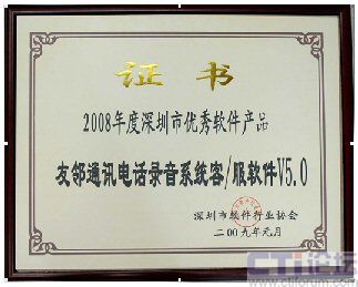 2009年1月,友鄰通訊電話錄音系統(tǒng)客/服軟件V5.0 榮獲由深圳市軟件行業(yè)協(xié)會頒發(fā)的“2008年度深圳市優(yōu)秀軟件產(chǎn)品”榮譽證書!2008年度深圳市優(yōu)秀軟件產(chǎn)品”的評選是深圳市軟件行業(yè)協(xié)會在全市范圍內(nèi)舉辦的軟件產(chǎn)品推優(yōu)活動,經(jīng)過了企業(yè)申報、技術(shù)資料審核、專家評審等等幾大嚴格篩選程序。