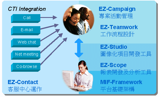 EZactor客服中心CRM平臺系統(tǒng),以MIF-Framework模塊為平臺基礎架構,在該強大之穩(wěn)定架構上以EZ-Contact模塊作為客服中心運作核心,另外延伸有EZ-Campaign、EZ-Teamwork、EZ-Scope、EZ-Studio等模塊,分別提供營銷活動管理、工作流程設計、數(shù)據(jù)統(tǒng)計與分析、項目開發(fā)工具等功能,全面滿足客服中心運行之需要。