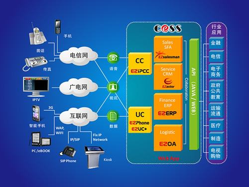 正因為IP客服中心將成為新一代的趨勢,億迅總結十年大系統(tǒng)與在地化建置經(jīng)驗,推出以「CESS」( Consumer Enterprise Service Software )消費型企業(yè)服務軟件概念的一系列產(chǎn)品,以快速上線、彈性調(diào)適、大范圍部署、跨國支持、商務活動導向、高投資回報為訴求,自2009年底推廣起已吸引兩岸一百多家消費型中小企業(yè)采用,并成為中國大陸職教機構服務人才培訓的基礎設備。