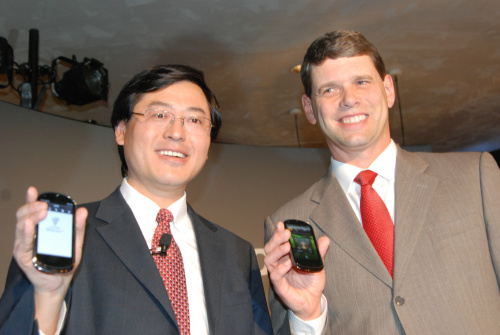圖:聯(lián)想集團(tuán)CEO楊元慶和COO Rory Read向與會(huì)者展示聯(lián)想集團(tuán)首款智能手機(jī)樂(lè)phone