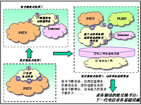 與IP基礎(chǔ)設(shè)施的作用類似,基于IP的業(yè)務(wù)驅(qū)動的軟交換平臺是電信業(yè)務(wù)開發(fā)、運(yùn)行和管理的基礎(chǔ)設(shè)施,是下一代電信網(wǎng)絡(luò)的重要組成部分。下圖給除了軟交換應(yīng)用的主要階段,指出了建設(shè)下一代電信業(yè)務(wù)基礎(chǔ)設(shè)施的重要性。