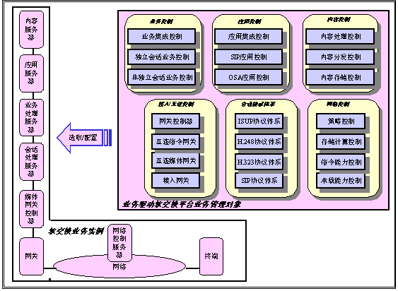 我們已經(jīng)看到,軟交換技術(shù)支持的電信業(yè)務(wù)能力一直在不斷發(fā)展,開發(fā)新的電信業(yè)務(wù)已經(jīng)成為電信運(yùn)營商市場競爭的重要條件。事實上,業(yè)務(wù)能力是電信運(yùn)營商或是電信用戶關(guān)心的基本問題,而不是實現(xiàn)這種業(yè)務(wù)的具體的技術(shù)和體系結(jié)構(gòu)。選擇何種技術(shù)和結(jié)構(gòu),則是電信運(yùn)營商依據(jù)自有的資源做出的選擇。因此,業(yè)務(wù)驅(qū)動的軟交換平臺需要根據(jù)實際的情況選取合適的技術(shù)和結(jié)構(gòu)實現(xiàn)所需的業(yè)務(wù)。我們把實現(xiàn)電信業(yè)務(wù)中涉及的要素稱為業(yè)務(wù)管理對象。軟交換平臺涉及到以下的六類業(yè)務(wù)管理對象:會話協(xié)議體系、接入/互連控制、業(yè)務(wù)控制、應(yīng)用控制、內(nèi)容控制和網(wǎng)絡(luò)控制。會話協(xié)議體系是任何電信業(yè)務(wù)的基礎(chǔ)。對接入、互聯(lián)、業(yè)務(wù)、應(yīng)用和內(nèi)容的控制也是建立電信業(yè)務(wù)所必需的。網(wǎng)絡(luò)控制涉及到一個新業(yè)務(wù)和網(wǎng)絡(luò)全局的關(guān)系。除了平臺管理業(yè)務(wù)之外,每個業(yè)務(wù)管理對象均包含一個可選擇/可設(shè)計的集合,供業(yè)務(wù)設(shè)計時使用。所有這些業(yè)務(wù)管理對象的集合,構(gòu)成了業(yè)務(wù)驅(qū)動軟交換平臺的控制功能的整體。下圖給除了業(yè)務(wù)驅(qū)動軟交換平臺上的業(yè)務(wù)管理對象,以及從這些業(yè)務(wù)管理對象映射的軟交換系統(tǒng)實例。