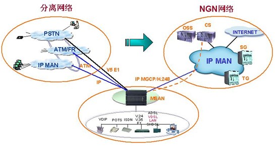 隨著運(yùn)營商光進(jìn)銅退大潮的推進(jìn),融合了寬帶和傳統(tǒng)窄帶接入、同時支持PSTN和NGN的MSAN綜合接入設(shè)備成為運(yùn)營商網(wǎng)絡(luò)建設(shè)的新熱點(diǎn)。MSAN的應(yīng)用可以降低運(yùn)維成本,提升業(yè)務(wù)投放的靈活度,有助于運(yùn)營商從傳統(tǒng)固網(wǎng)運(yùn)營商向多業(yè)務(wù)運(yùn)營商的角色轉(zhuǎn)變。MSAN的引入不但可以充分兼容現(xiàn)有的PSTN、ATM以及IP網(wǎng)絡(luò)、提供TDM語音、窄帶數(shù)據(jù)業(yè)務(wù)、寬帶業(yè)務(wù)和視頻業(yè)務(wù)的綜合接入,還可以適用于未來的NGN,提供VoIP業(yè)務(wù)。