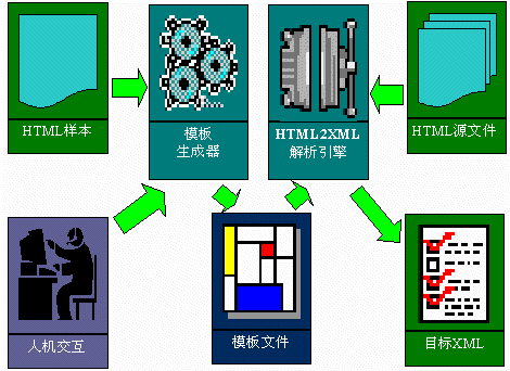 HTML2XML1.0中包括了兩個(gè)工具:HTML2XML模板生成器和HTML2XML解析引擎。通過該HTML2XML模板生成器的GUI界面和HTML2XML解析引擎,將HTML文件中的<Table>標(biāo)記中的數(shù)據(jù),根據(jù)指導(dǎo)性文件,轉(zhuǎn)換成XML格式數(shù)據(jù),供其他應(yīng)用程序進(jìn)行進(jìn)一步處理。