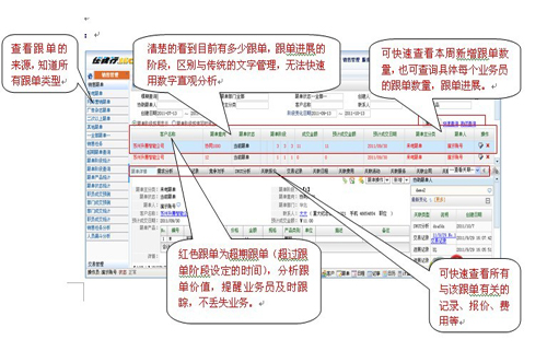2、通過軟件對跟單的業(yè)務(wù)進展記錄固化,清晰掌握該跟單由誰創(chuàng)建、誰去談單、報價有無競爭對手、有無難點等進展一覽無余,避免了傳統(tǒng)的電話、面對面溝通。