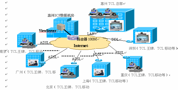 2) 多媒體控制服務器ViewServer托管到ICP數(shù)據(jù)機房,采用100M共享,各企業(yè)及分公司的網(wǎng)絡接入靈活選擇,可以選用ADSL、LAN等寬帶接入;