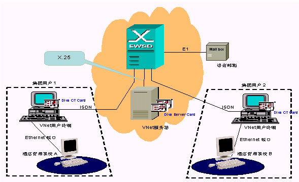 圖中集團(tuán)用戶1與集團(tuán)用戶2內(nèi)部使用了配置Eicon 公司Diva CT Card的Vnet系統(tǒng)用戶終端,同時接入ISDN設(shè)備與EWSD交換機(jī)連接,信號通過EWSD交換機(jī)響應(yīng)給配置Eicon