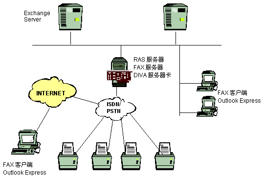 終端設備:FAX Client(也可以用OUTLOOK 98/EXPRESS)主要是對FAX Mail進行再處理, 比如可以指定到可用的打印機或傳真機打印等。