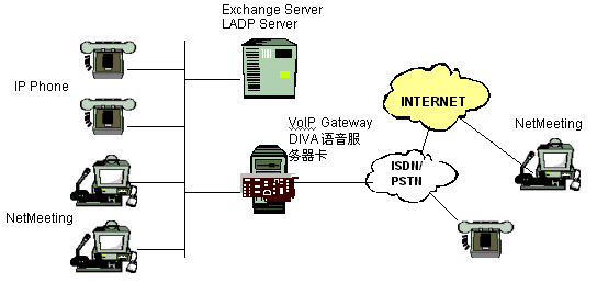 VoIP Gateway:可以通過使用LDAP(Lightweight Directory Access Protocol)來實現(xiàn) SoftPBX。 LDAP可以讓應用程序來訪問目錄信息,比如可以從目錄中數(shù)據(jù)庫中訪問用戶的 電子郵件地址,電話號碼等。 DIVA VoIP 網(wǎng)關服務器也包含完整的語音郵件服務器。 用于進行地址解析的Exchange服務器同樣也可以進行語音郵件的轉(zhuǎn)發(fā)。當任何終端沒有回答呼入呼叫時DIVA VoIP 網(wǎng)關服務器可以播放一段問候語然后錄下你的留言。被錄下的語 音留言將做為電子郵件的附件被傳送到被叫用戶的電子郵箱中。