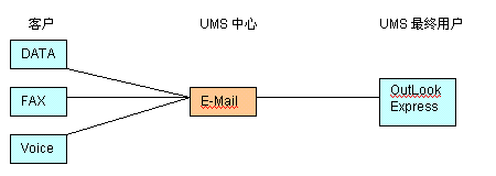 UMS的起源可追溯到數(shù)據(jù),傳真和語音三大應用的整合,即統(tǒng)一為E-Mail形式,在企業(yè)內(nèi) 部或INTERNET郵件系統(tǒng)轉(zhuǎn)發(fā)。實現(xiàn)起來也較簡單,如下圖所示: