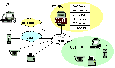客戶用電子郵件、語音、尋呼、移動短消息、傳真等與UMS用戶聯(lián)系,UMS中心啟動相應的服務與客戶建立連接,將客戶所發(fā)信息按識別標識直接轉(zhuǎn)發(fā)到UMS用戶或中繼服務器,若因UMS用戶不在等原因,無法直接聯(lián)系,系統(tǒng)會提示客戶選擇別的方式聯(lián)系。也可將其存儲,并進行必要的格式轉(zhuǎn)換與管理,這時UMS中心可以主動呼叫UMS用戶的手機,傳真機,電話等主動將信息送到,UMS用戶也可以在任何時間、任何地點,從固定電話網(wǎng)(普通電話、傳真機、IC卡電話等)、移動網(wǎng)(GSM、模擬、CDMA、WAP手機、掌上電腦、PDA等)、尋呼網(wǎng)、互聯(lián)網(wǎng)(PC)訪問中心服務器查詢,索取個人信息。