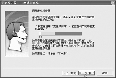 待音量?jī)x式穩(wěn)定后,點(diǎn)擊“下一步”測(cè)試麥克風(fēng)的安放位置,再次朗讀對(duì)話框中的例句,然后聽(tīng)一下回放的錄音是否清晰。一切調(diào)整好后,點(diǎn)擊“完成”。