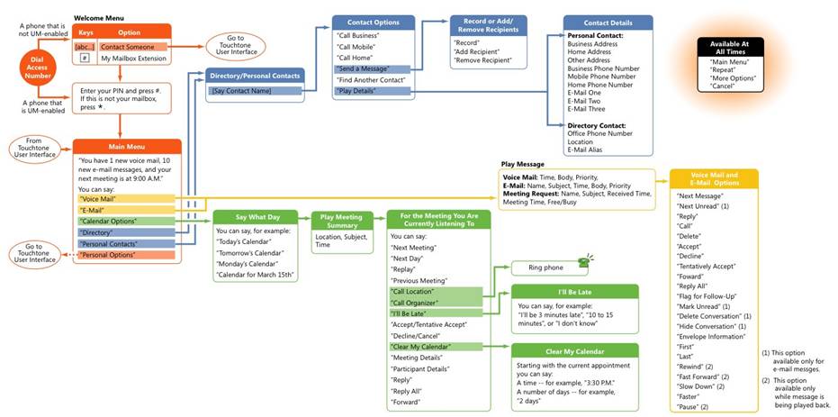 允許用戶通過電話處理他們的消息和日歷數(shù)據(jù)(包括收聽、轉(zhuǎn)發(fā)和回復(fù)電子郵件,以及發(fā)出、更新或響應(yīng)會議請求)。用戶可以標記消息以便跟蹤、跳到下一封未讀郵件、隱藏或刪除對話,甚至查找來自特定用戶的消息,這一切全都使用語音導(dǎo)航或標準按鍵式鍵盤來完成。