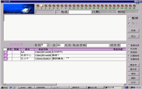 后臺(tái)主要完成對(duì)短信息的收發(fā),包括群收、群發(fā)的處理,還有生日祝福、定時(shí)發(fā)送、短信中心號(hào)碼的設(shè)置等(參見使用說(shuō)明書),即完成與廣播平臺(tái)無(wú)關(guān)的一些處理。