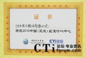 CTI論壇(ctiforum)10月14日消息(記者 潘婷婷):2010年9月28日,恒生通信應(yīng)邀出席由中國(guó)電子商會(huì)呼叫中心與客戶關(guān)系管理專業(yè)委員會(huì)(CNCCA)主辦,國(guó)家工業(yè)和信息化部支持,CTI論壇承辦的2010中國(guó)呼叫中心產(chǎn)業(yè)峰會(huì)。憑借在中國(guó)呼叫中心領(lǐng)域技術(shù)及市場(chǎng)的領(lǐng)先地位,恒生通信榮獲中國(guó)電大會(huì)組委會(huì)頒發(fā)的中國(guó)(亞太)最佳呼叫中心供應(yīng)商大獎(jiǎng)。這已是恒生通信自2007年來連續(xù)第四年獲此殊榮。