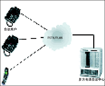 目前,根據(jù)建設(shè)思路中所提到的分期實(shí)施原則,第一期只完成本地多方電話會(huì)議中心平臺(tái)的建設(shè)。參加電話會(huì)議的各方用戶均直接通過公眾電話網(wǎng)撥入中心平臺(tái),由中心平臺(tái)統(tǒng)一接入并組織會(huì)議資源為用戶服務(wù),結(jié)構(gòu)如圖2所示。