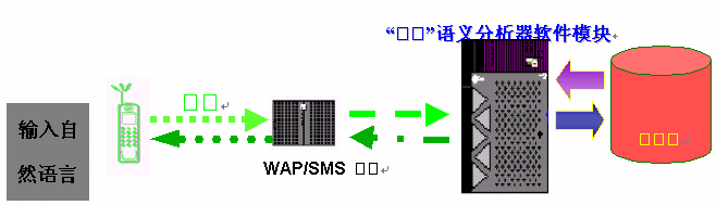 如上圖所示,現(xiàn)有的數(shù)據(jù)通信和短信服務(wù)的技術(shù)平臺(tái)完全不需要進(jìn)行變動(dòng),只需在網(wǎng)關(guān)的后端集成"得意"語(yǔ)義分析器軟件模塊,對(duì)用戶通過(guò)短信發(fā)來(lái)的文本進(jìn)行分析和理解,然后從對(duì)應(yīng)的知識(shí)庫(kù)中獲得用戶所需的信息,發(fā)送回用戶手機(jī)。