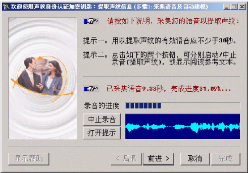 點擊"提取聲紋"按鈕,按正常方式說出含有30秒有效語音的任意一段話(在此過程中,可隨時點擊"中止錄音"以放棄語音采集,并重新開始)。