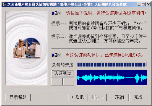 完成上述步驟后,點擊"完成"按鈕,系統(tǒng)將把該用戶的聲紋信息,以及音量設(shè)置、閾值設(shè)置等信息保存起來,供隨后的"身份驗證"過程使用。