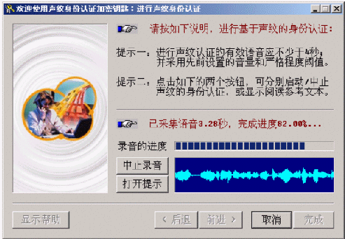 在彈出的窗口中輸入用戶名并點擊"語音身份認證"按鈕,從彈出窗口中點擊"聲紋認證"按鈕,根據(jù)系統(tǒng)提示,對著麥克風(fēng)說出含有4秒以上有效語音的任意一段話,讓系統(tǒng)進行聲紋身份認證。如果被拒絕,系統(tǒng)會顯示一個對話框,提示用戶選擇是繼續(xù)嘗試,還是放棄;如果通過,則系統(tǒng)會自動打開用戶的私有加密文件目錄。
