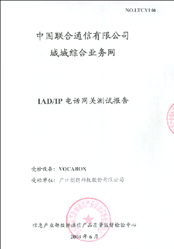 。。近日,廣州創(chuàng)想科技股份有限公司得到信產(chǎn)部數(shù)據(jù)通信產(chǎn)品質(zhì)量監(jiān)督檢測(cè)中心的通知:VOCABOX/IAD通過(guò)了中國(guó)聯(lián)通城域綜合業(yè)務(wù)網(wǎng)IAD/IP電話語(yǔ)音網(wǎng)關(guān)入圍測(cè)試。