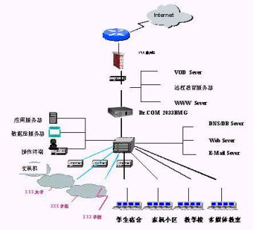 BRAS的驗證才能上網(wǎng)。校園網(wǎng)系統(tǒng)應(yīng)能覆蓋整個校園,并連接所有的學(xué)院和辦公區(qū),為大學(xué)開展現(xiàn)代化的經(jīng)營管理和辦公教學(xué)提供一個具有開放式體系結(jié)構(gòu)的計算機網(wǎng)絡(luò)系統(tǒng),具有高度的可靠性和可擴展能力。對校園網(wǎng)內(nèi)的每一用戶(老師或?qū)W生)、閱覽室、圖書館、多媒體教室等都能夠進行單獨的管理、計費(時長、時段、包月、流量)、驗證、授權(quán)(瀏覽、下載、收發(fā)信件、網(wǎng)站屏蔽)、共享、帶寬分配。尤其對學(xué)生和老師區(qū)別的管理非常獨特。
