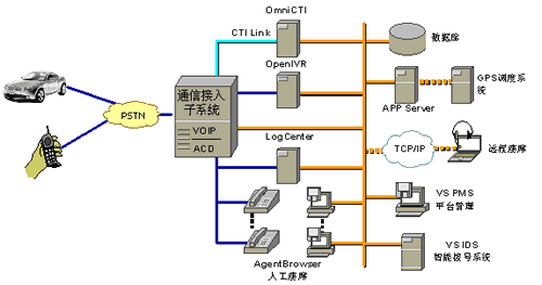 CommSuites For GPS呼叫中心除了提供傳統(tǒng)呼叫中心功能外,還增加了GPS功能,是一個全方位的解決方案,下面是系統(tǒng)的結(jié)構(gòu)圖: