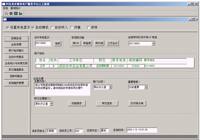 企業(yè)或個(gè)人打入電話(huà)后,可以選擇人工服務(wù),同座席話(huà)務(wù)人員直接溝通,由話(huà)務(wù)人員將企業(yè)或個(gè)人反映的問(wèn)題和提出的建議意見(jiàn)記錄下來(lái),并同時(shí)記錄下該客戶(hù)的聯(lián)系方式,將相關(guān)數(shù)據(jù)添加入系統(tǒng)數(shù)據(jù)庫(kù);也可以在數(shù)據(jù)庫(kù)的支持下回答企業(yè)或個(gè)人對(duì)科技成果和政策法規(guī)的咨詢(xún)和疑問(wèn)。企業(yè)或個(gè)人也可以選擇自動(dòng)語(yǔ)音服務(wù)方式,根據(jù)系統(tǒng)的語(yǔ)音提示輸入按鍵,選擇類(lèi)別,將自己的投訴和建議以及自己的聯(lián)系方式信息以留言錄音的方式保存在系統(tǒng)中。系統(tǒng)同時(shí)還支持自動(dòng)傳真方式,企業(yè)或個(gè)人可以通過(guò)傳真機(jī)打通客戶(hù)服務(wù)中心,通過(guò)按鍵選擇傳真方式,將自己的意見(jiàn)建議等的文本內(nèi)容傳真給系統(tǒng),系統(tǒng)自動(dòng)接受并存入數(shù)據(jù)庫(kù)。